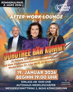 Am 19.01. lädt die Junge Union in den Showroom des Autohauses MedeleSchäfer ein. Wir empfangen Euch mit Musik und Erfrischungen. Wir sprechen darüber, wie wir die Zukunft unseres Landkreises gestalten und wie das neu strukturierte Ministerium für Forschung, Technologie und Raumfahrt dazu beitragen kann, dass ganz Deutschland wieder zurück auf die Erfolgsspur findet.